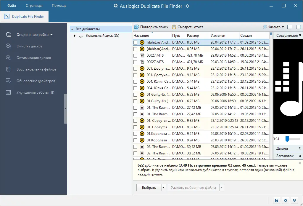 - Позволяет быстро освободить место, отмечая дубликаты для удаления или перемещения.