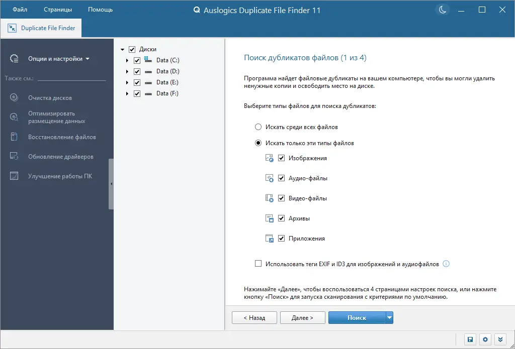 - Поиск дубликатов всех типов, включая изображения, музыку, видео и архивы.
