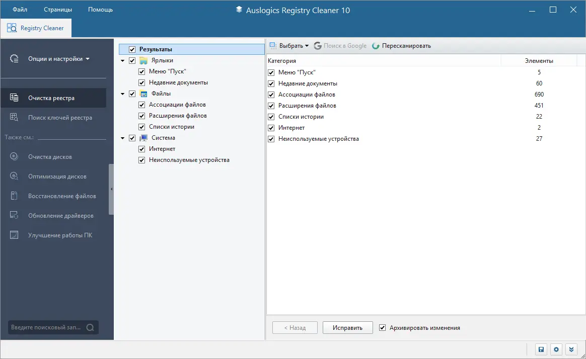 Работа с Auslogics Registry Cleaner