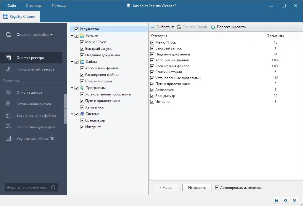 Работа с Auslogics Registry Cleaner