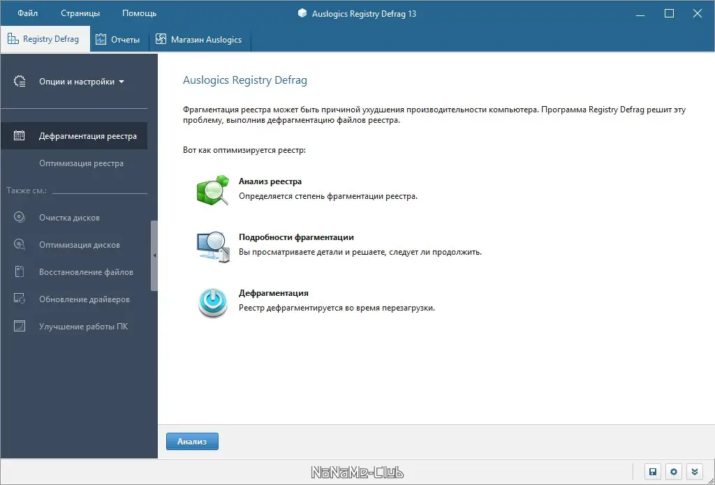 Auslogics Registry Defrag предназначена для глубокой оптимизации реестра Windows, который со временем становится фрагментированным из-за постоянной установки и удаления программ, обновлений системы и других изменений. Чем больше фрагментирован реестр, тем дольше система тратит времени на поиск нужных записей, что замедляет общую работу ПК. Утилита решает эту проблему, перестраивая структуру реестра для максимально быстрого доступа.