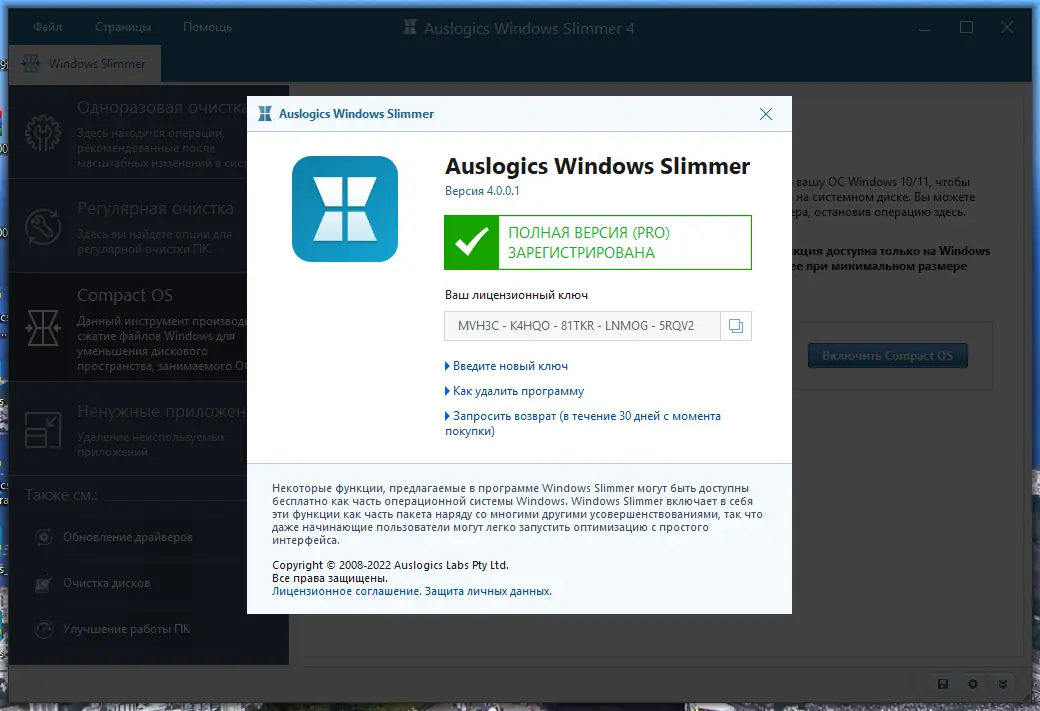 Auslogics Windows Slimmer — это инструмент для глубокой оптимизации операционной системы, направленный на уменьшение занимаемого системой места и повышение общей эффективности работы компьютера. Программа позволяет деинсталлировать ненужные компоненты Windows, удалять предустановленные приложения и настраивать системные параметры для снижения нагрузки на ресурсы. Благодаря интуитивному интерфейсу и продуманной логике, утилита подходит как новичкам, так и опытным пользователям, стремящимся к максимальной производительности.