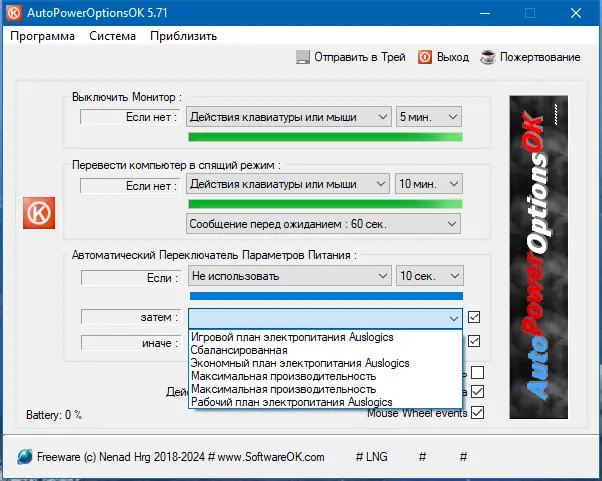 AutoPowerOptionsOK представляет собой легковесное приложение, ориентированное на автоматизацию управления энергосбережением операционной системы. Утилита работает в фоне, не нагружая систему, и позволяет точно настраивать поведение ПК в зависимости от времени бездействия или заданных пользователем условий. Благодаря своей простоте и эффективности, программа подойдёт как обычным пользователям, так и тем, кто стремится к более гибкому контролю над энергопотреблением.