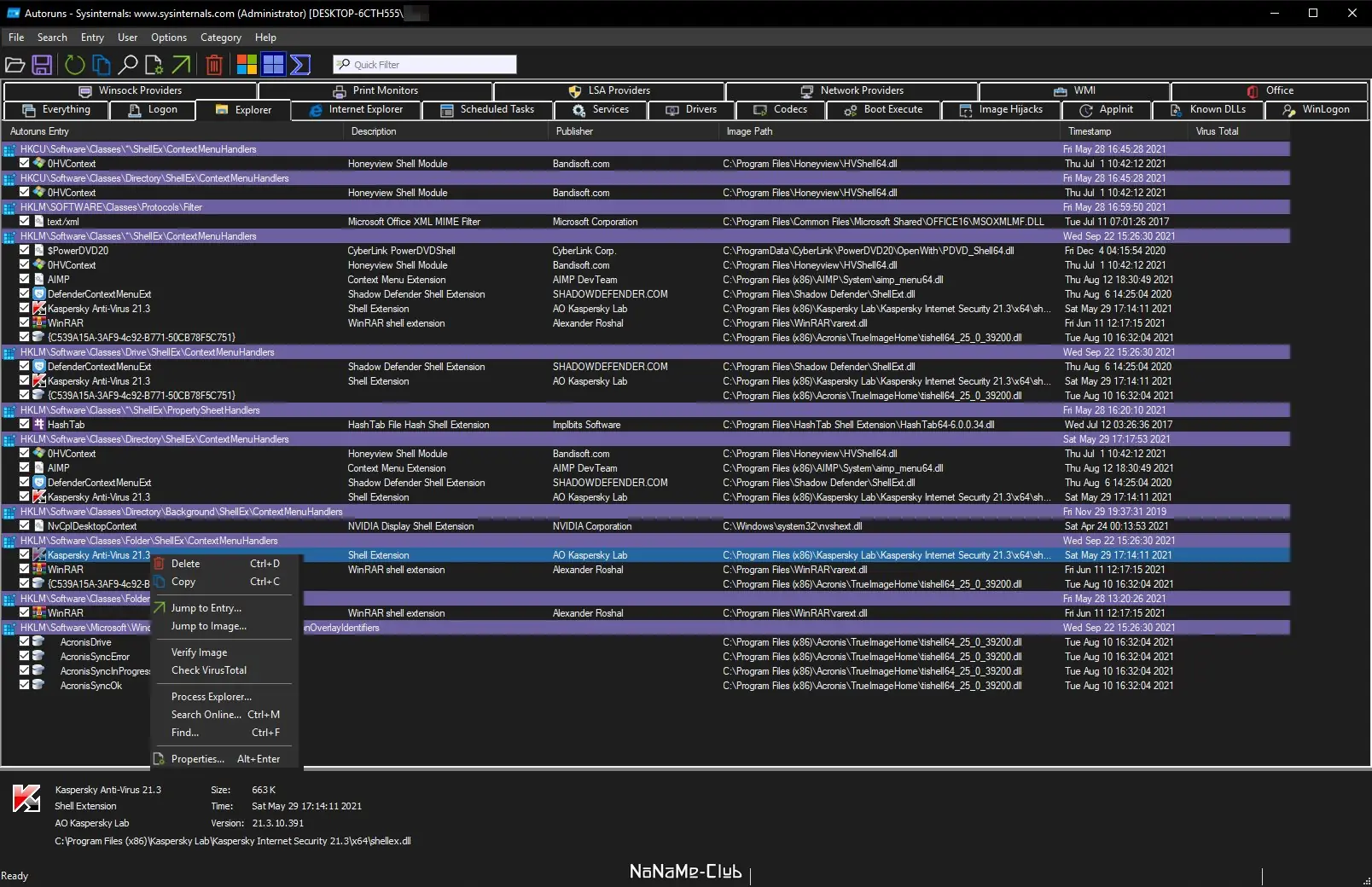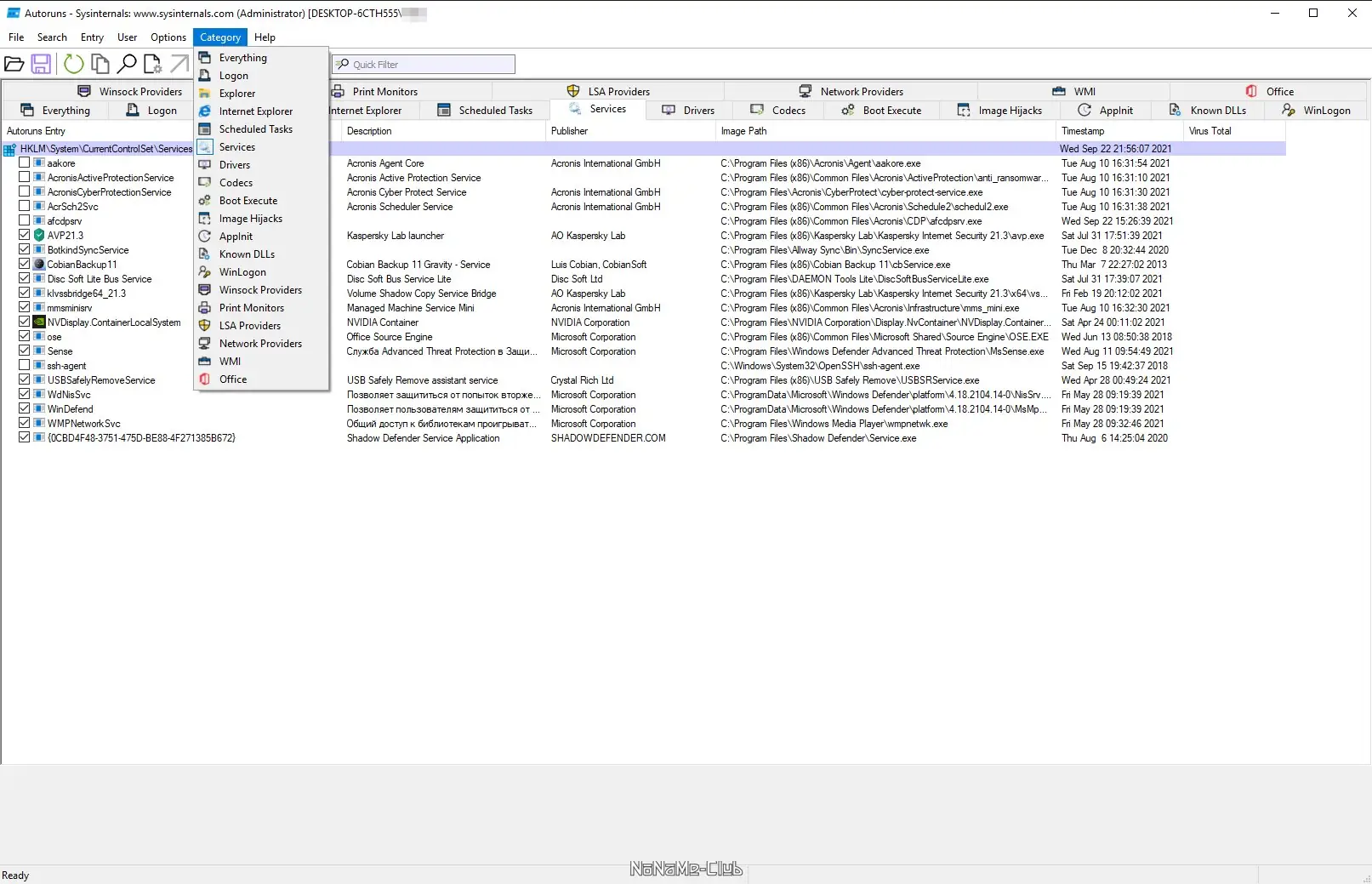 - Отображает все точки автозапуска, включая реестр, папки автозагрузки, службы и расширения оболочки