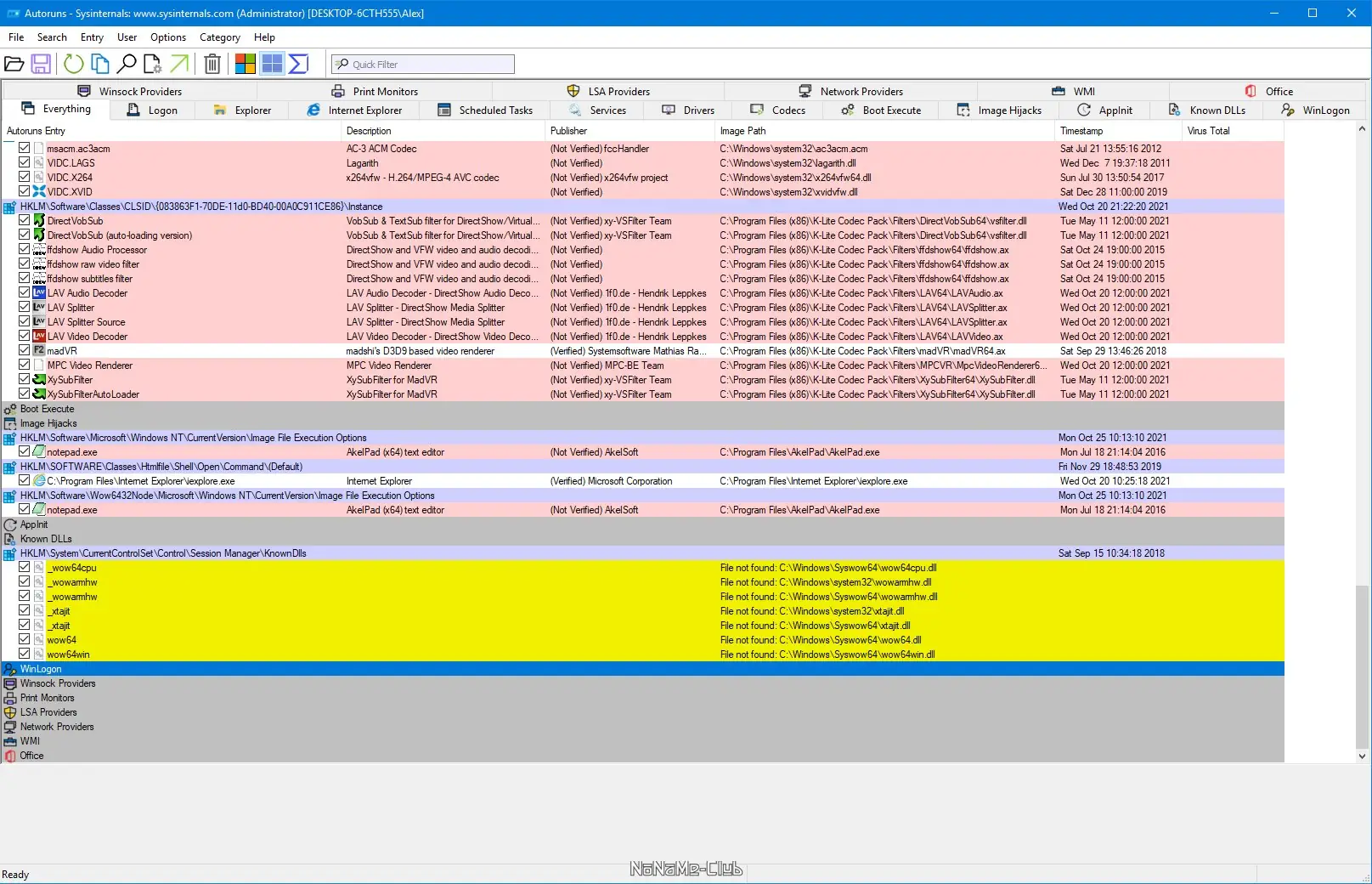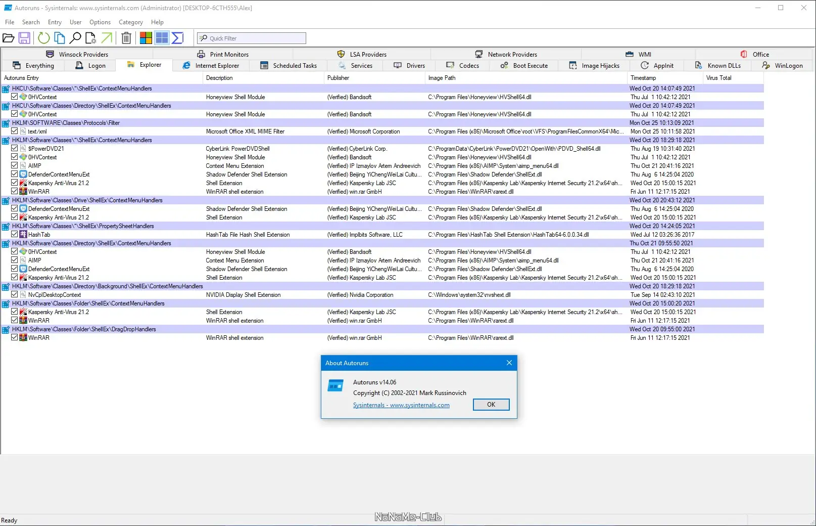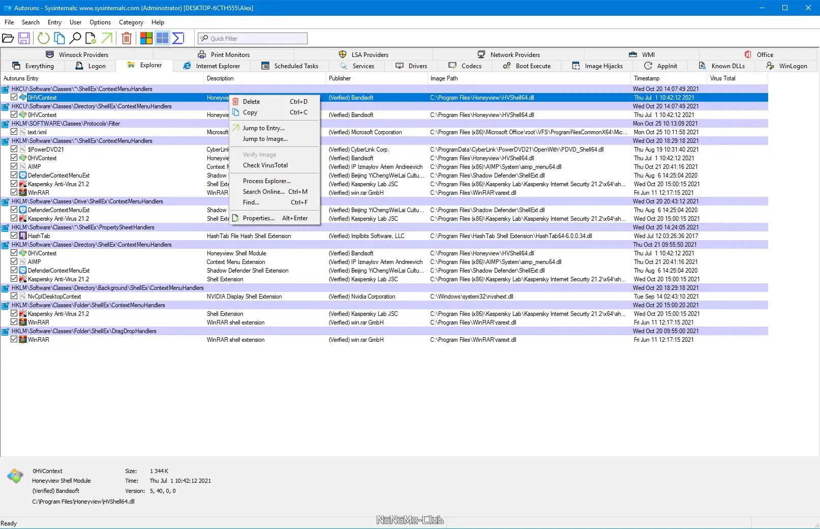 - Отображает все точки автозагрузки, включая реестр, службы, задачи, библиотеки и расширения оболочки