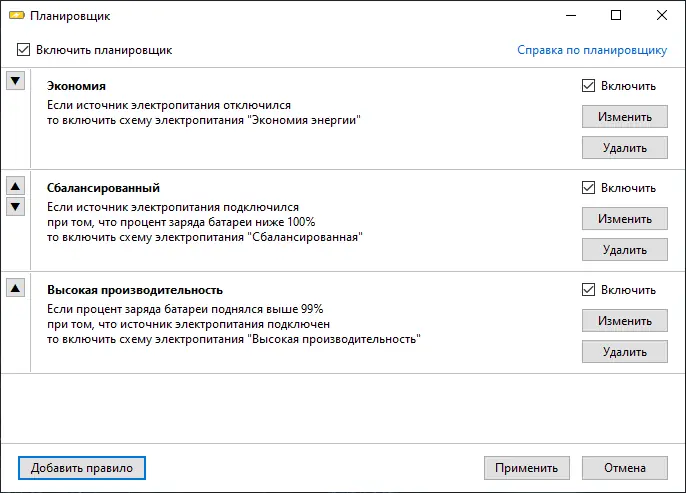 Использование Battery Mode не требует специальных знаний. После установки утилита запускается автоматически и размещает свой значок в области уведомлений. Клик по нему открывает главное окно с переключателями режимов питания и ползунком регулировки яркости. Пользователь может настроить отображение процента заряда, изменить стиль значка в зависимости от темы системы, а также задать действие по умолчанию для кнопки в нижней части интерфейса. Через вкладку «Планировщик» можно создавать правила, срабатывающие при подключении зарядного устройства, переходе в сон или изменении состояния экрана. Для тех, кто предпочитает автоматизацию, доступны параметры командной строки, позволяющие встраивать Battery Mode в сторонние скрипты.