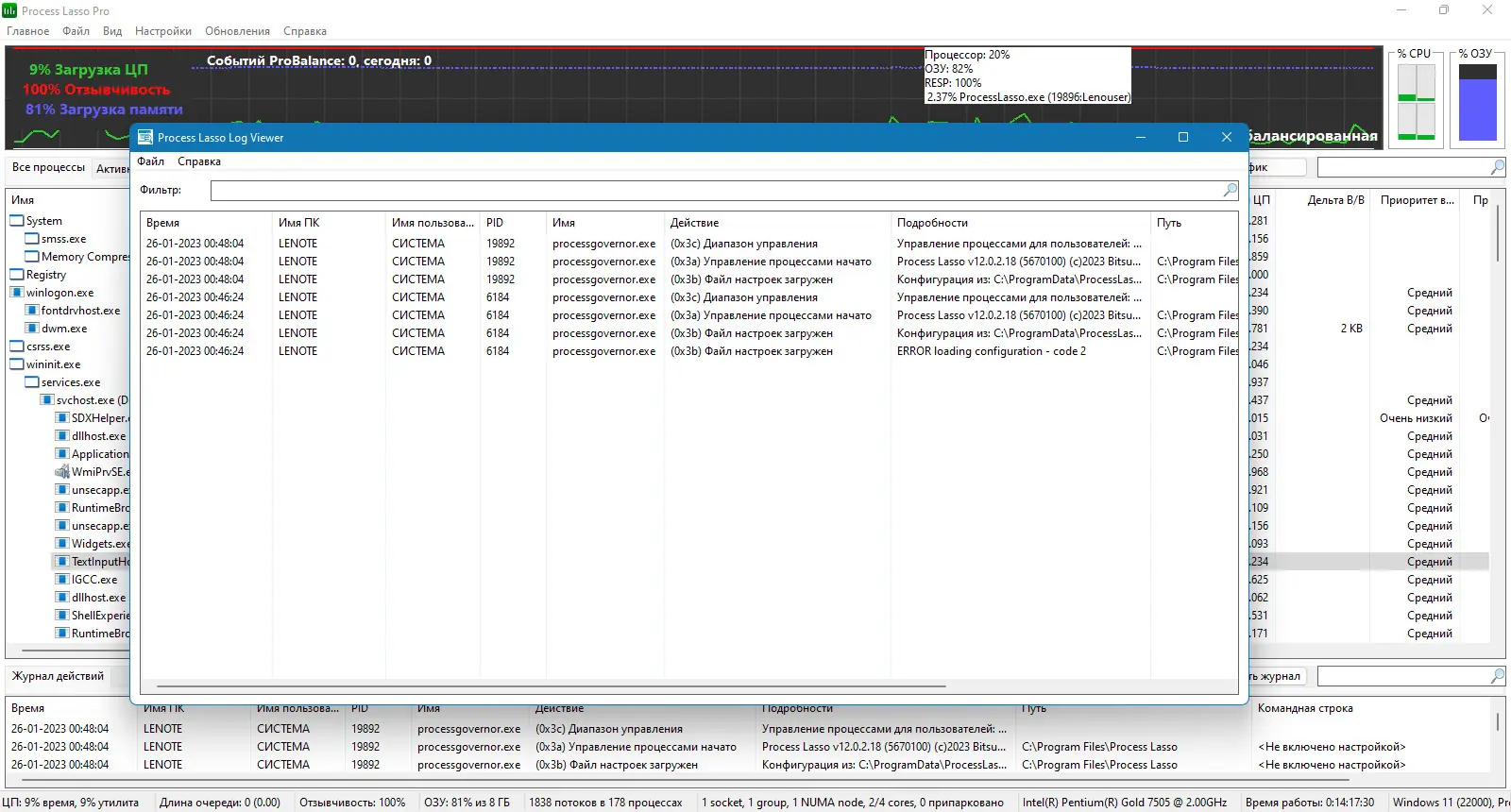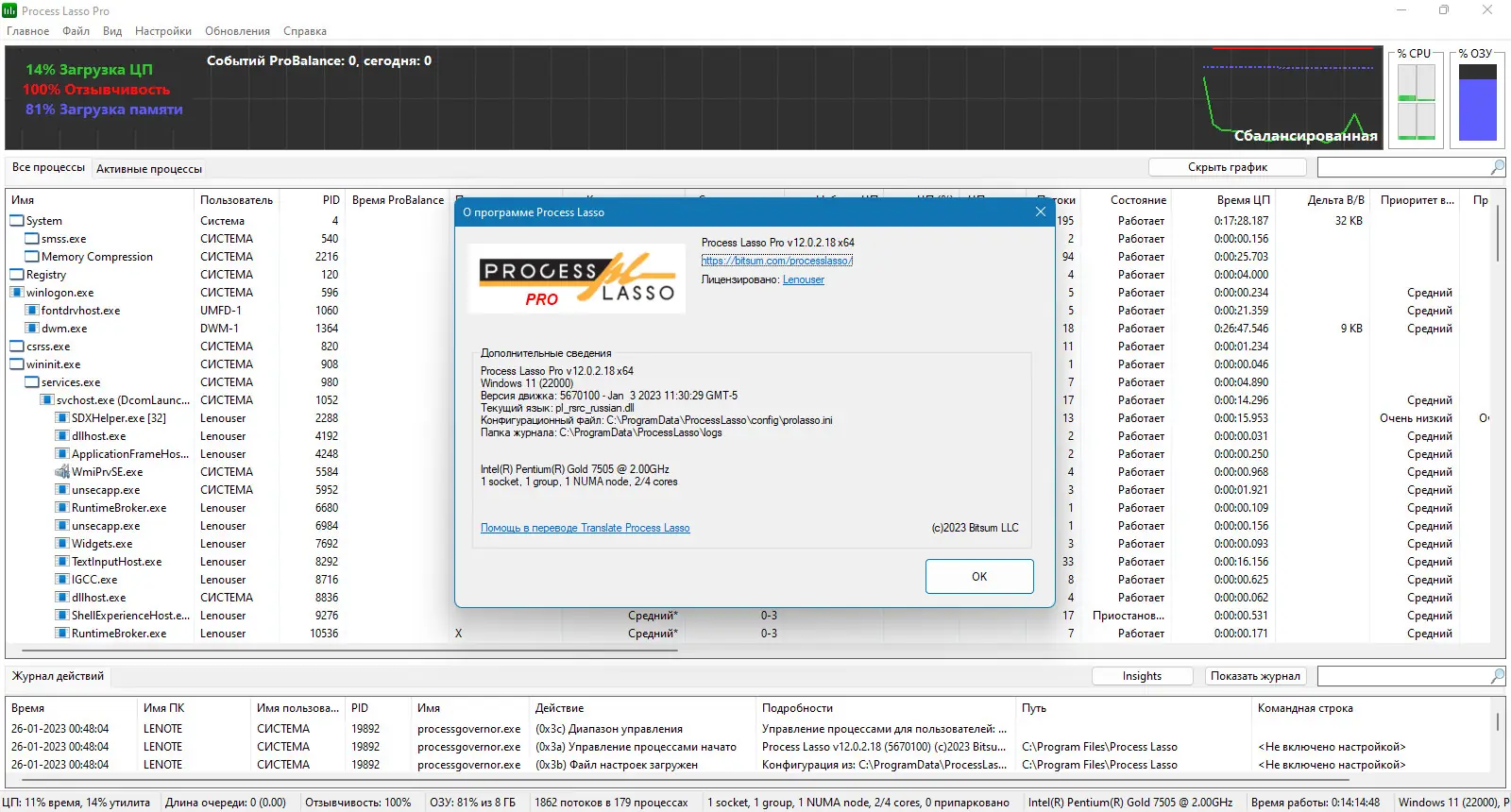 Bitsum Process Lasso — системная утилита для тонкой настройки приоритетов процессов в реальном времени, направленная на повышение отзывчивости операционной системы. Программа автоматически контролирует активность программ, снижая нагрузку от «прожорливых» процессов, что предотвращает подтормаживания и зависания. Использование технологии ProBalance обеспечивает стабильную работу даже при высокой загрузке центрального процессора.