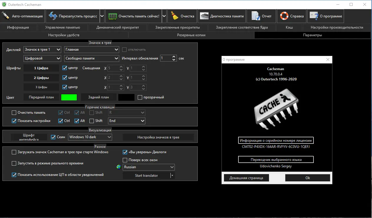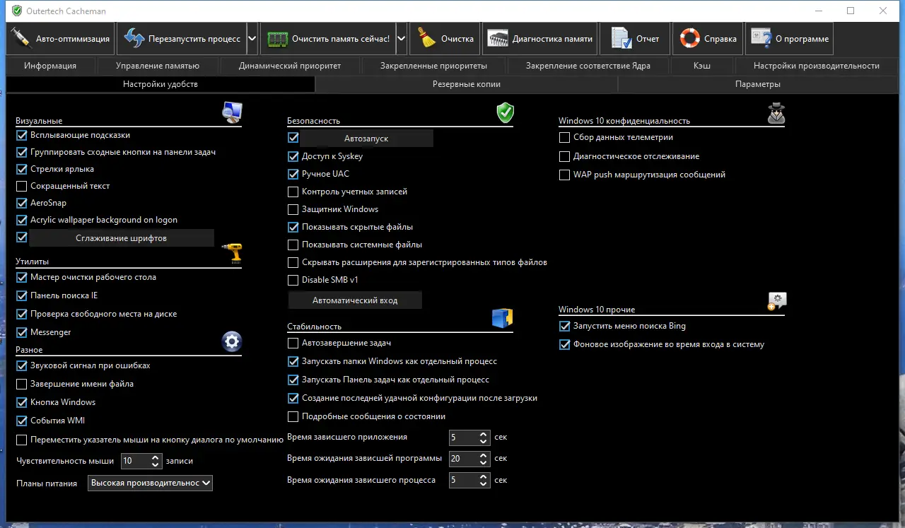 Интерфейс Cacheman интуитивно понятен и организован по принципу «оптимизация за один клик». После установки достаточно запустить процесс автонастройки, чтобы программа проанализировала конфигурацию системы и применила наиболее эффективные параметры. Расширенные настройки позволяют вручную корректировать поведение кэширования, управлять фоновыми процессами и настраивать приоритеты приложений. Также доступен мониторинг загрузки ЦП и использования ОЗУ через иконку в системном трее.