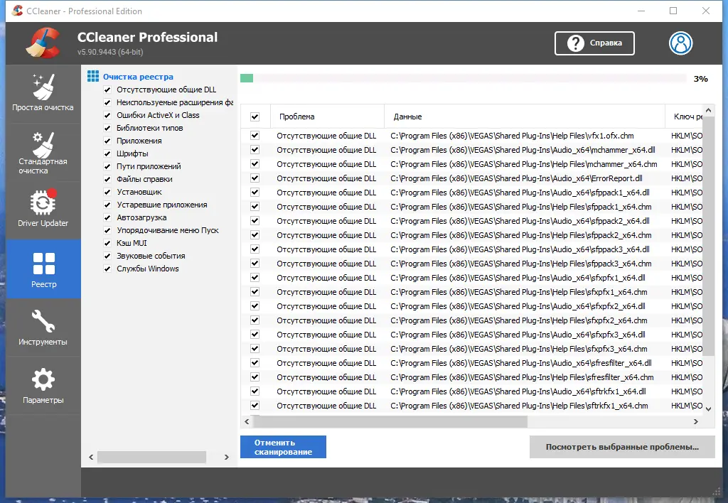 - Осуществляется анализ реестра Windows с выявлением неверных путей, устаревших расширений и неработающих ссылок.