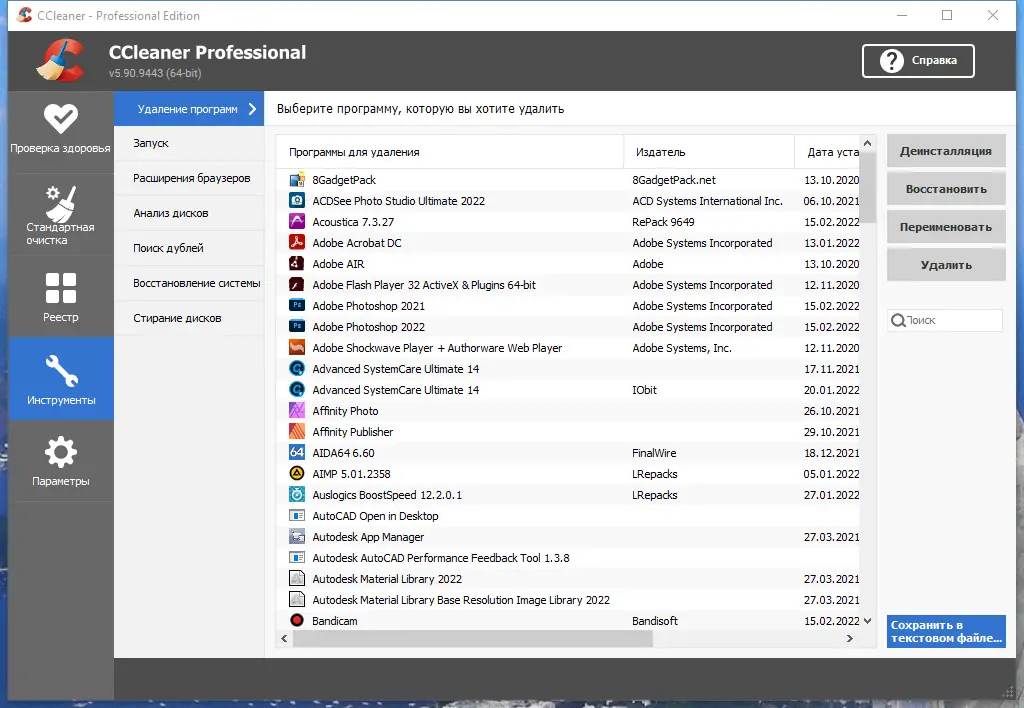 CCleaner — это системная утилита, предназначенная для оптимизации и обслуживания операционной системы Windows. Она сканирует компьютер на наличие временных, кэшированных и ненужных файлов, а затем предлагает их удалить, освобождая дисковое пространство и ускоряя работу системы. Программа анализирует как компоненты самой ОС, так и сторонние приложения, включая популярные браузеры, мультимедийные проигрыватели, офисные пакеты и архиваторы. Удаление следов интернет-серфинга позволяет повысить конфиденциальность, убирая историю посещений, куки и данные автозаполнения. Также утилита очищает буфер обмена, временные файлы Windows, список недавних документов и содержимое корзины. Поддержка множества приложений делает её универсальным решением для поддержания чистоты в системе.