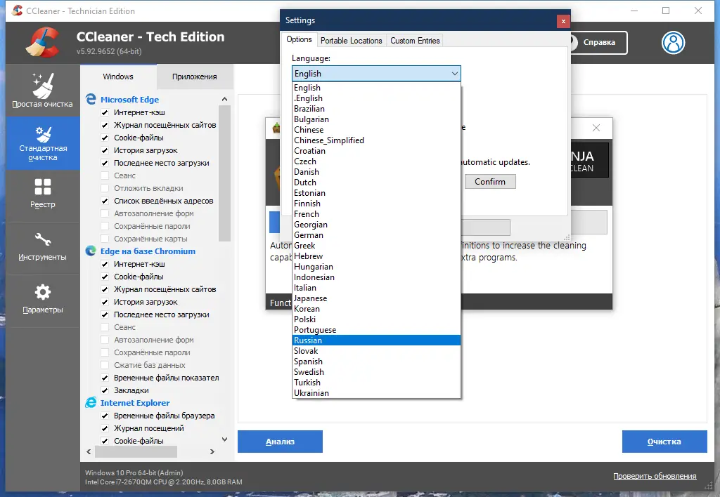 - Поддержка большого количества приложений и браузеров для комплексной очистки.