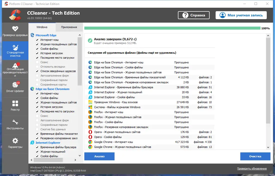 - Осуществляется очистка системных компонентов: буфер обмена, журнал событий, список недавних документов, содержимое корзины и дампы памяти.