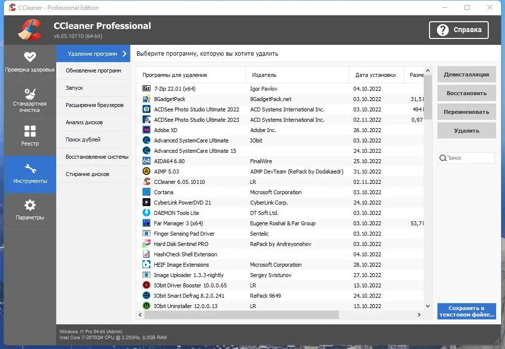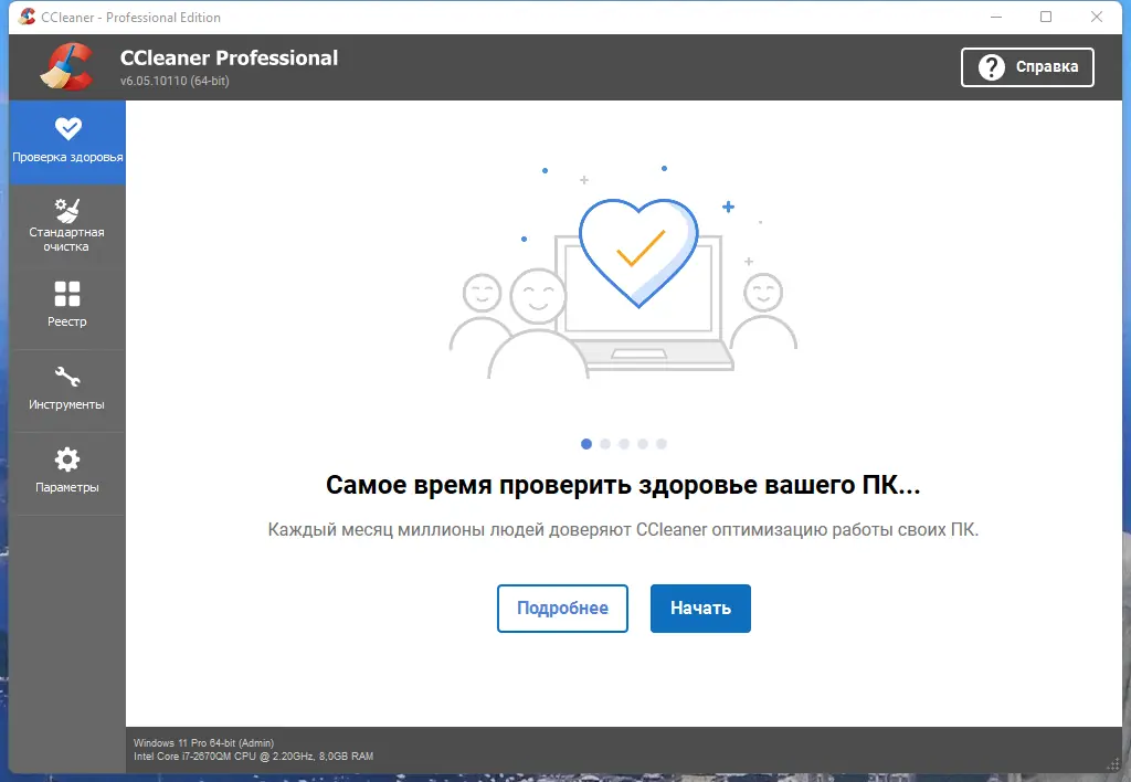 CCleaner — это системная утилита для очистки операционной системы от временных, ненужных и устаревших файлов, а также оптимизации реестра Windows. Программа эффективно удаляет следы интернет-активности, временные данные приложений и системные файлы-мусор, освобождая место на диске и повышая общую производительность компьютера. Она поддерживает широкий спектр браузеров и сторонних программ, обеспечивая безопасную и глубокую очистку без риска повреждения системы. Работа с инструментом проста и интуитивно понятна, а встроенные функции резервного копирования и проверки делают использование надёжным даже для новичков. С её помощью можно легко поддерживать систему в чистоте и порядке, продлевая срок её стабильной работы.
