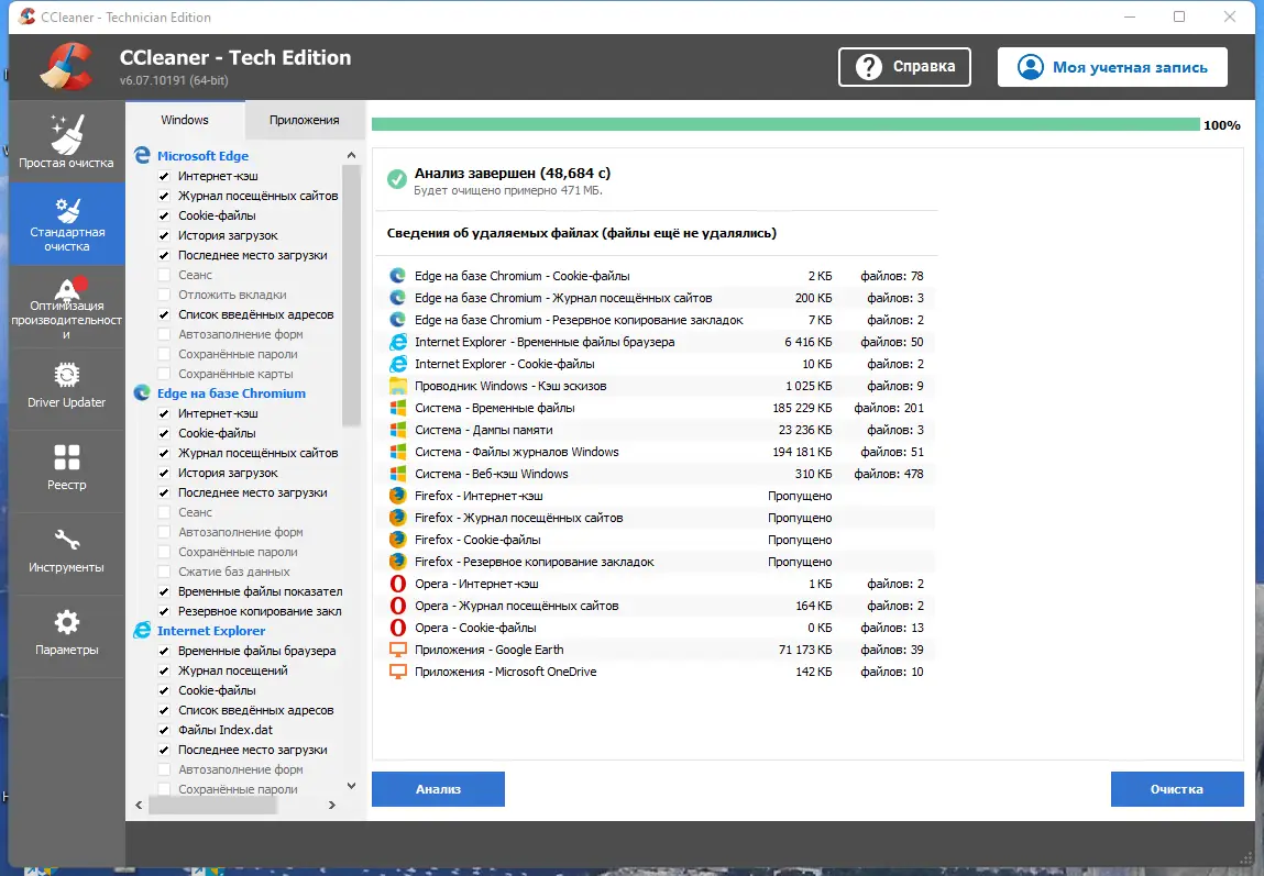 - Очищает временные файлы и куки всех популярных веб-браузеров, включая Chrome, Firefox, Opera и Edge.