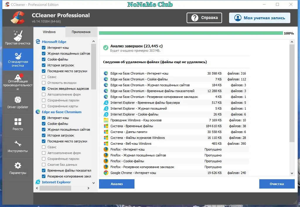 - Очищает временные файлы и кэш из множества приложений, включая Google Chrome, Firefox, Opera и других.