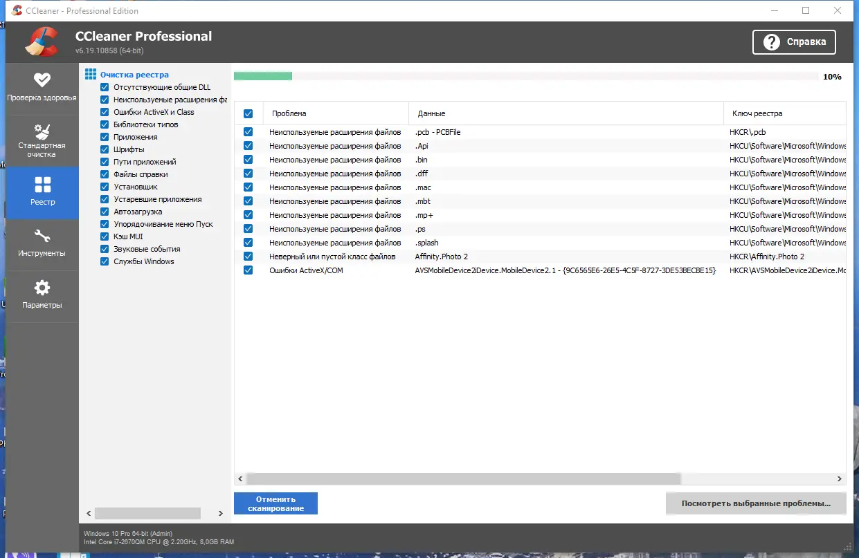 - Очистка реестра Windows от битых ссылок, устаревших записей и неработающих путей