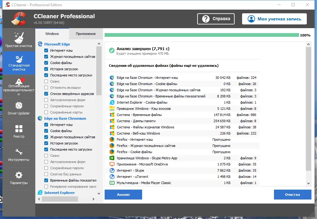 После запуска CCleaner пользователь видит вкладку анализа, где можно выбрать категории для проверки — интернет, приложения, Windows, реестр. Нажатие кнопки «Анализ» запускает сканирование системы на наличие ненужных данных. После завершения отображается список найденных элементов, и пользователь решает, что именно удалить. В разделе реестра доступна предварительная проверка и резервное копирование перед внесением изменений. Все настройки можно кастомизировать, исключив из очистки важные файлы или добавив собственные правила через сторонние модули. Портативная версия позволяет использовать утилиту без установки, что удобно для диагностики разных систем.