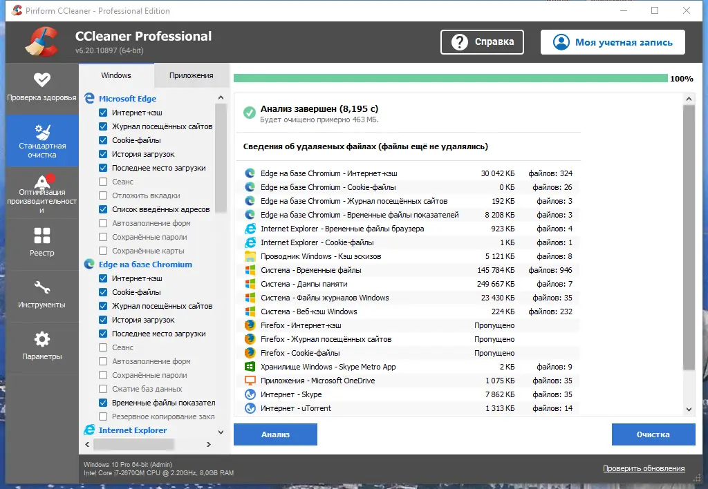 - Удаляет временные файлы, куки, историю посещений и кэш из популярных браузеров, включая Google Chrome, Firefox, Opera и Internet Explorer.