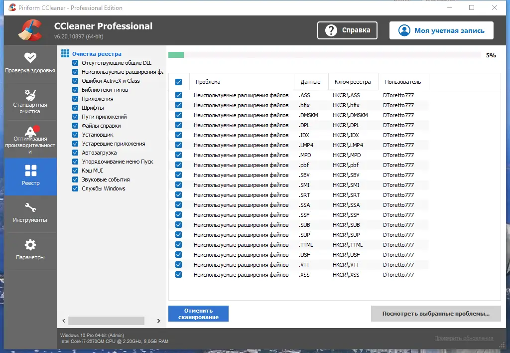 - Проводит диагностику и очистку реестра от нерабочих ссылок, лишних расширений, устаревших библиотек DLL и неверных путей.