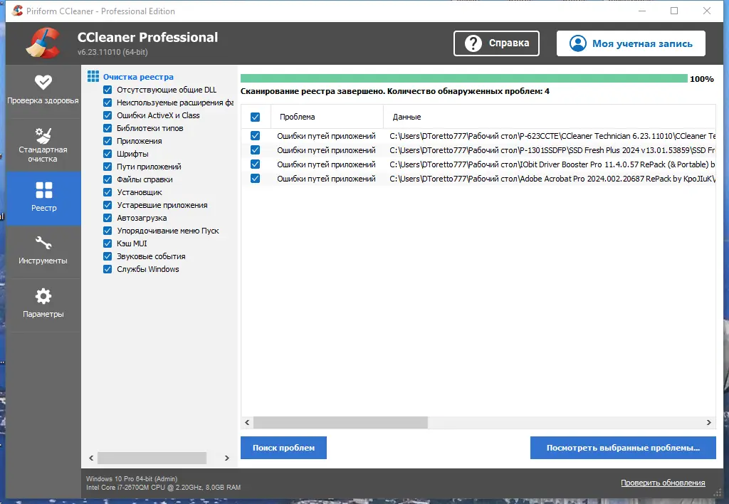 - Обладает встроенным инструментом для анализа и исправления ошибок в реестре Windows, включая неверные пути, остатки удалённых программ и устаревшие DLL.