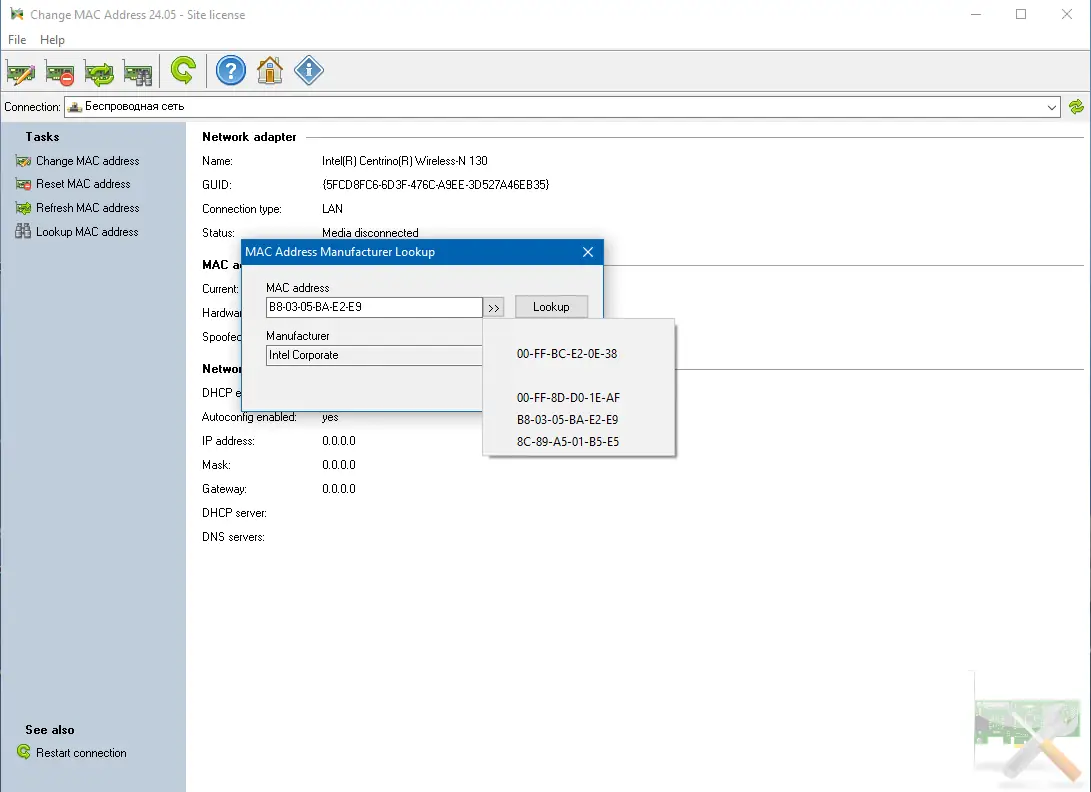 Пользоваться программой просто: после запуска она автоматически определяет доступные сетевые интерфейсы и отображает их текущие MAC-адреса. Пользователь может выбрать один из предустановленных адресов, сгенерировать новый или ввести вручную. Для смены идентификатора достаточно нажать кнопку применения — изменения вступят в силу немедленно. Утилита также позволяет проверить производителя по OUI-коду, что помогает подбирать правдоподобные комбинации. Результаты сканирования можно сохранить в текстовом формате или экспортировать как HTML-документ для последующего анализа. База данных включает описания более чем 16 000 сетевых карт, что обеспечивает высокую точность идентификации.