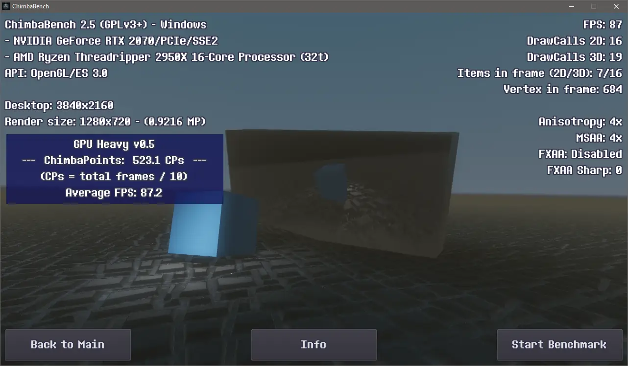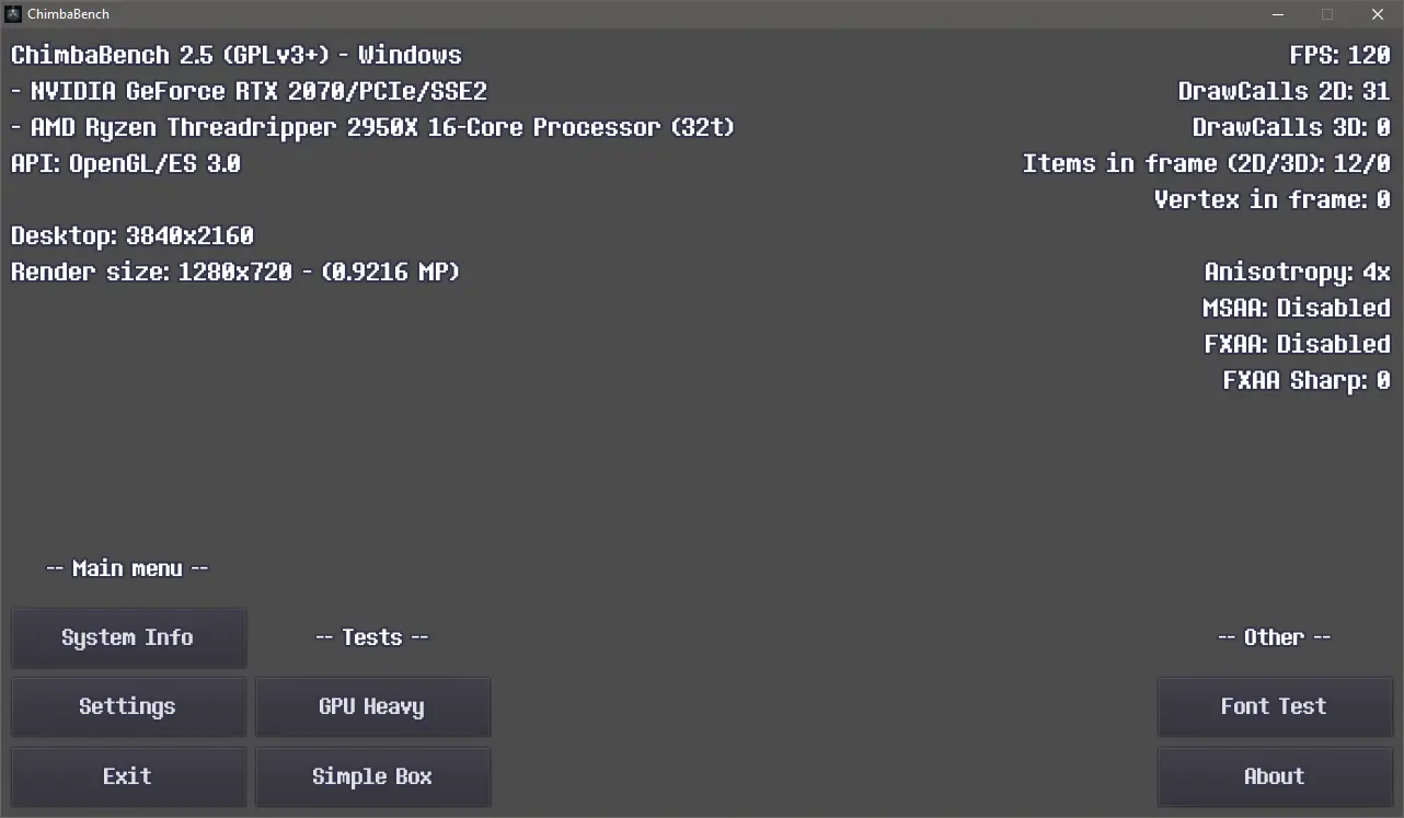 ChimbaBench — это компактная утилита для тестирования производительности видеокарты, которая отображает результаты как в условных единицах, так и в кадрах в секунду. Программа подходит для быстрой оценки графических возможностей системы под Windows и Linux, включая проверку стабильности при нагрузке.