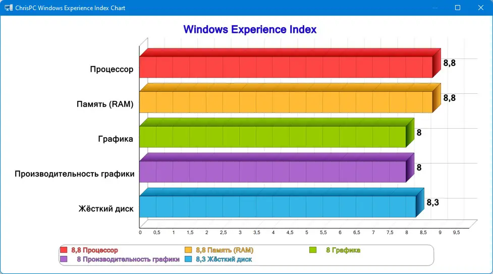 ChrisPC Win Experience Index — бесплатная утилита для оценки производительности компьютера под управлением Windows, позволяющая восстановить функционал устаревшего индекса производительности. Программа быстро анализирует ключевые компоненты системы и выводит оценку по шкале от 1.0 до 9.9, включая общую и детализированную информацию по процессору, оперативной памяти, видеокарте и диску.