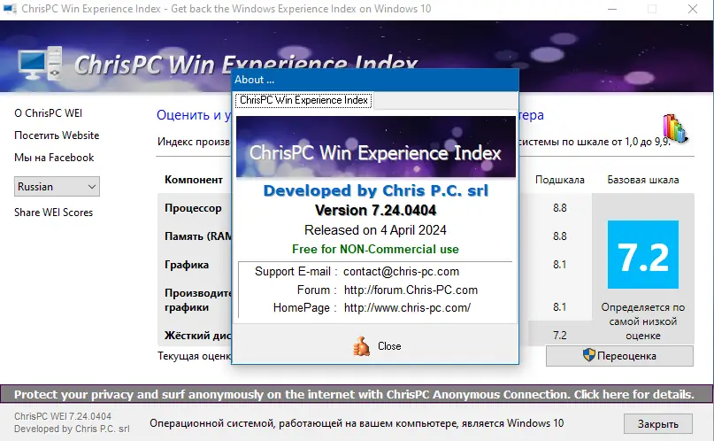 ChrisPC Win Experience Index предлагает простой и надёжный способ оценки производительности ПК. Утилита не нагружает систему избыточным функционалом, но при этом предоставляет точные и сопоставимые с официальным индексом результаты. Поддержка многопоточности и современных архитектур процессоров позволяет получать актуальные данные даже на новых конфигурациях.