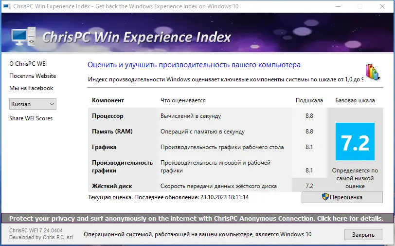 Программа ChrisPC Win Experience Index разработана для пользователей, которым важно понимать реальную производительность своего компьютера. В отличие от стандартного средства оценки производительности, которое Microsoft удалило из интерфейса начиная с Windows 8, данная утилита возвращает возможность быстро и наглядно оценить систему. Она проводит тестирование таких компонентов, как центральный процессор, оперативная память, видеоподсистема и скорость накопителя, выставляя баллы по каждому параметру.