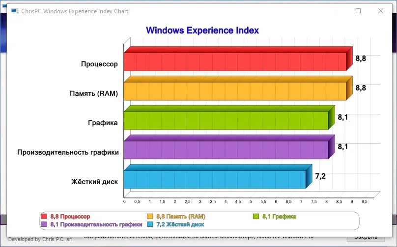 ChrisPC Win Experience Index — это бесплатная утилита для анализа производительности системы в операционных системах Windows, позволяющая восстановить и расширить функционал устаревшего Windows Experience Index. Программа оценивает ключевые компоненты компьютера по шкале от 1.0 до 9.9, предоставляя наглядные результаты по каждому аспекту производительности. Утилита совместима с современными версиями Windows, включая 11, 10, 8.1 и 7, и не требует сложной настройки после установки.
