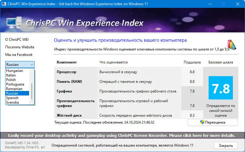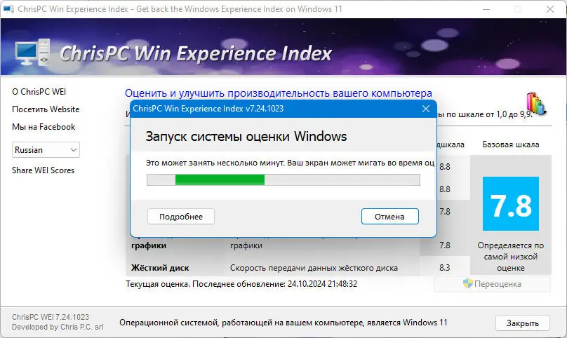 ChrisPC Win Experience Index разработана как альтернатива встроенному инструменту оценки производительности, который был удалён из современных версий Windows. Утилита поддерживает операционные системы начиная с Windows 7 и заканчивая последними обновлениями Windows 11, включая версию 24H2. Она позволяет провести комплексный анализ аппаратных возможностей компьютера без необходимости в глубоких технических знаниях. Программа не требует сложной настройки и начинает работать сразу после установки.