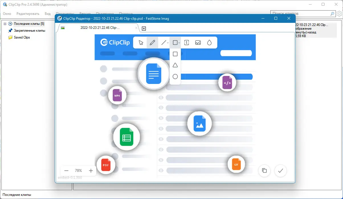 - Поддерживается сортировка клипов по типу контента: текст, изображения, HTML, файлы.