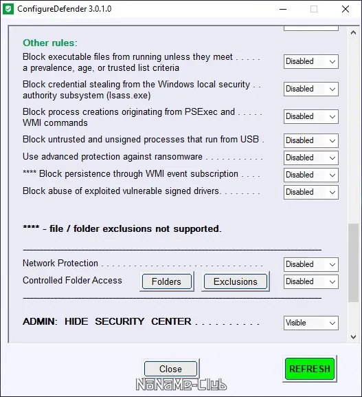 - Утилита позволяет изменять скрытые настройки Защитника Windows, включая поведение при обнаружении угроз и реакцию на подозрительные процессы.