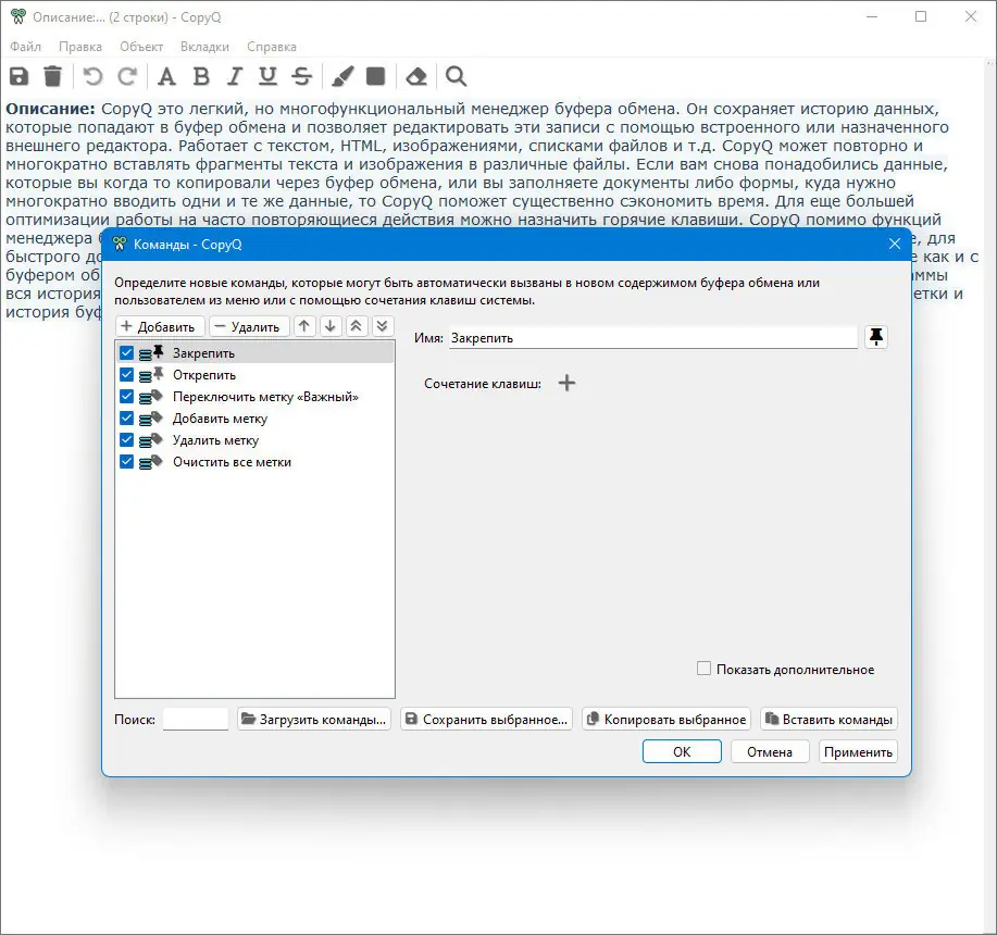 CopyQ — это многофункциональный менеджер буфера обмена с открытым исходным кодом, предназначенный для эффективного хранения и управления копируемыми данными. Программа поддерживает текст, изображения, HTML-код и другие форматы, позволяя быстро находить и повторно использовать информацию. Благодаря гибкой настройке и портативному режиму, она подходит как для повседневного использования, так и для профессиональных задач.