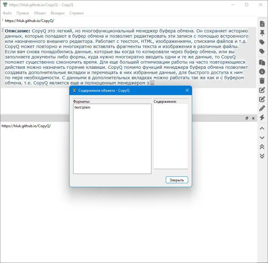 - Поддержка множества форматов: текст, изображения, HTML, списки файлов.