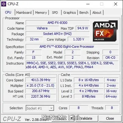 - Демонстрирует техпроцесс, напряжение питания ядра и температурные показатели при наличии датчиков