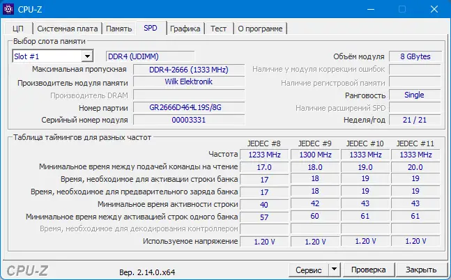 - Показывает объем, тип и тайминги оперативной памяти с данными из SPD