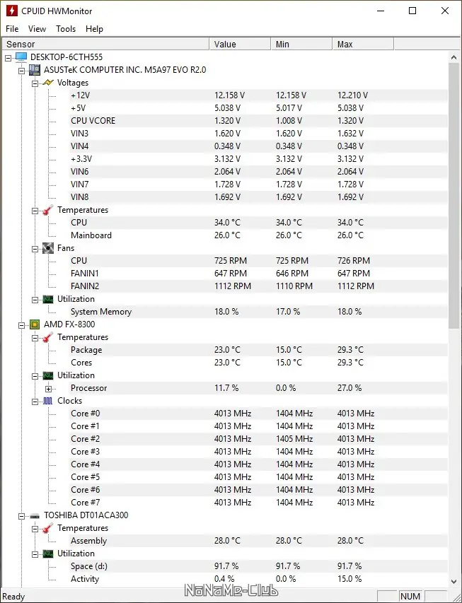 Интерфейс утилиты прост и интуитивно понятен. После запуска программа автоматически определяет установленное оборудование и начинает сбор данных. Основное окно отображает иерархическое дерево сгруппированных параметров, что упрощает навигацию. Пользователь может раскрыть разделы по компонентам — CPU, GPU, motherboard, drives — и увидеть текущие значения температур, напряжений и оборотов. Для удобства добавлены метки «min» и «max», показывающие диапазон изменения показателей с момента запуска. Никаких сложных настроек не требуется — всё работает «из коробки».