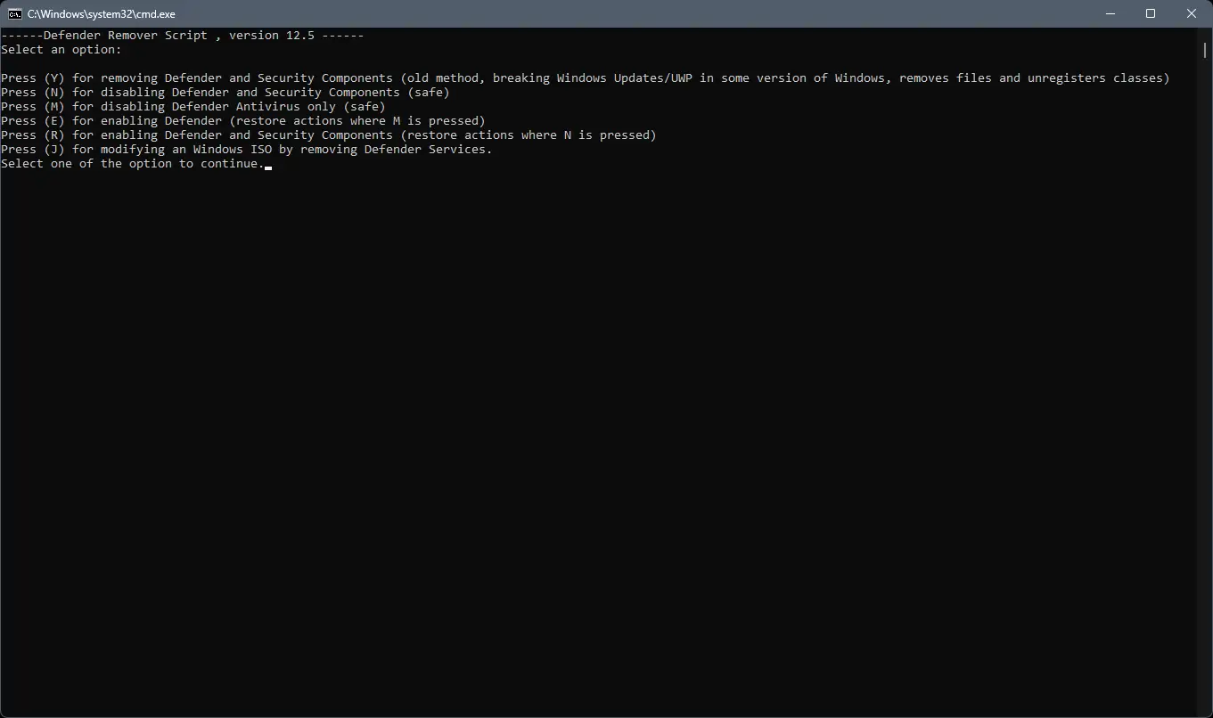 Использование программы предельно простое: после запуска от имени администратора откроется текстовый интерфейс с перечнем доступных опций. Пользователь выбирает нужное действие, вводя соответствующую букву, после чего система перезагрузится и применит изменения. Все изменения вступают в силу на уровне реестра и системных служб, что обеспечивает стойкое отключение компонентов. После завершения процесса можно установить или активировать сторонний антивирус без конфликтов с встроенной защитой.