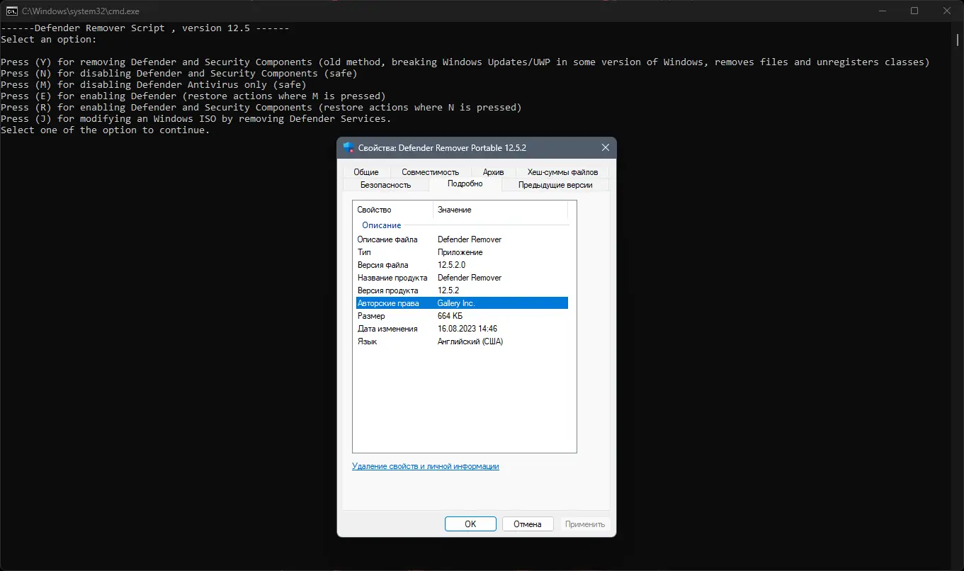 Defender Remover — это легковесное приложение, разработанное для управления компонентами безопасности операционной системы. Оно позволяет глубоко интегрироваться в систему, отключая не только сам антивирус, но и сопутствующие функции, которые могут мешать работе других защитных программ. Утилита не требует установки и работает напрямую с системными настройками, что делает её удобной для использования на разных компьютерах.