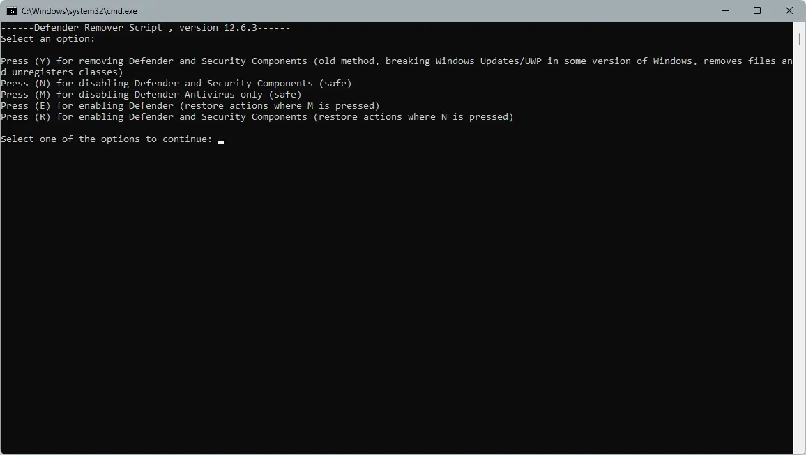 Использование утилиты предельно простое и не требует технических знаний. После запуска от имени администратора перед пользователем появляется текстовое меню с вариантами действий. Каждому действию соответствует определённая буква, которую нужно ввести для подтверждения. После выбора программа автоматически перезагружает систему и применяет изменения во время загрузки.