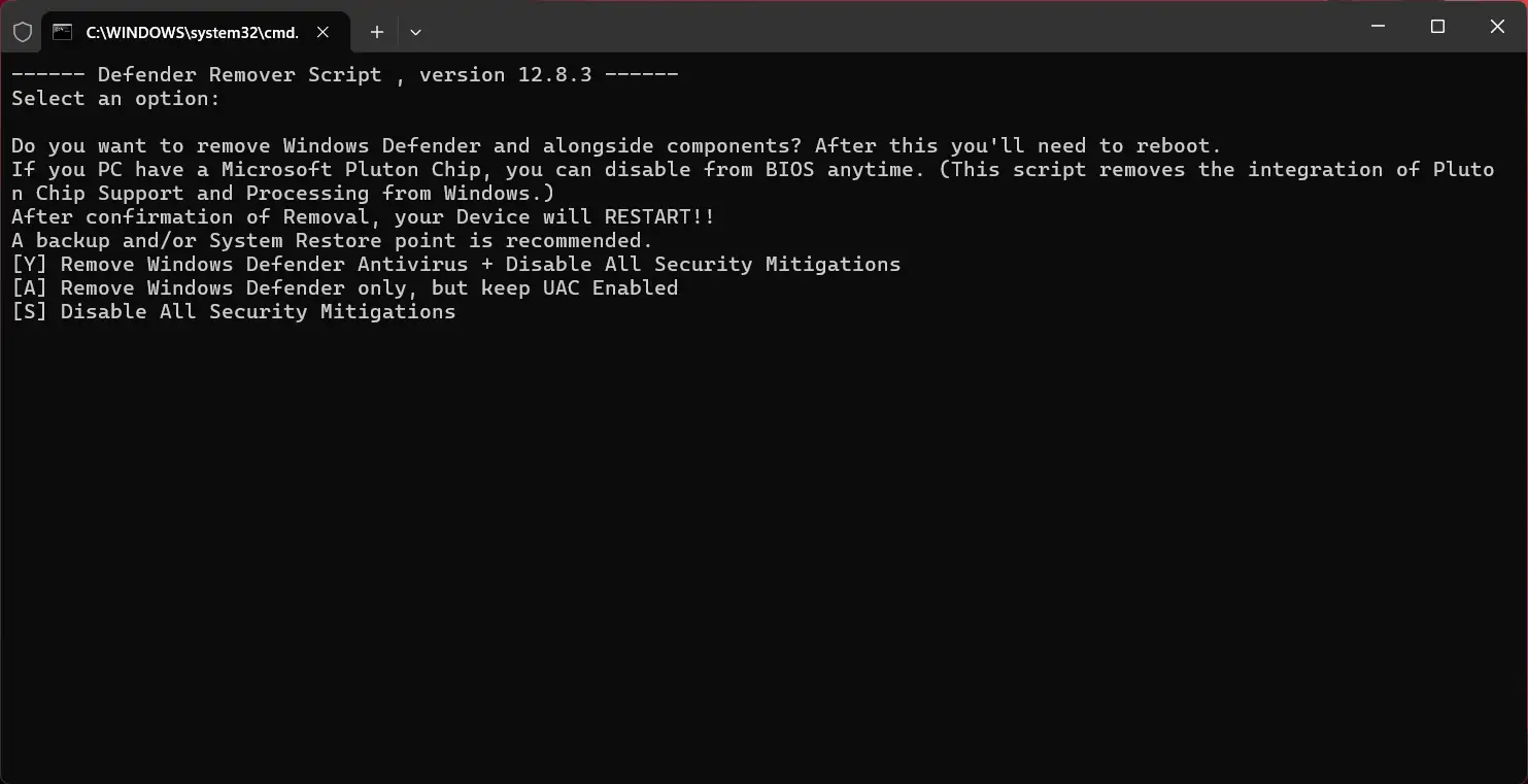 Запуск утилиты требует прав администратора для внесения изменений в системные параметры и реестр. После старта отображается консольное меню с тремя основными опциями: полное удаление, отключение защиты с сохранением UAC или отключение только системных мер. Выбор осуществляется вводом соответствующей буквы. Программа portable, поэтому не оставляет следов в реестре и может запускаться с флешки. После подтверждения действия система перезагружается, и все выбранные компоненты отключаются или удаляются.