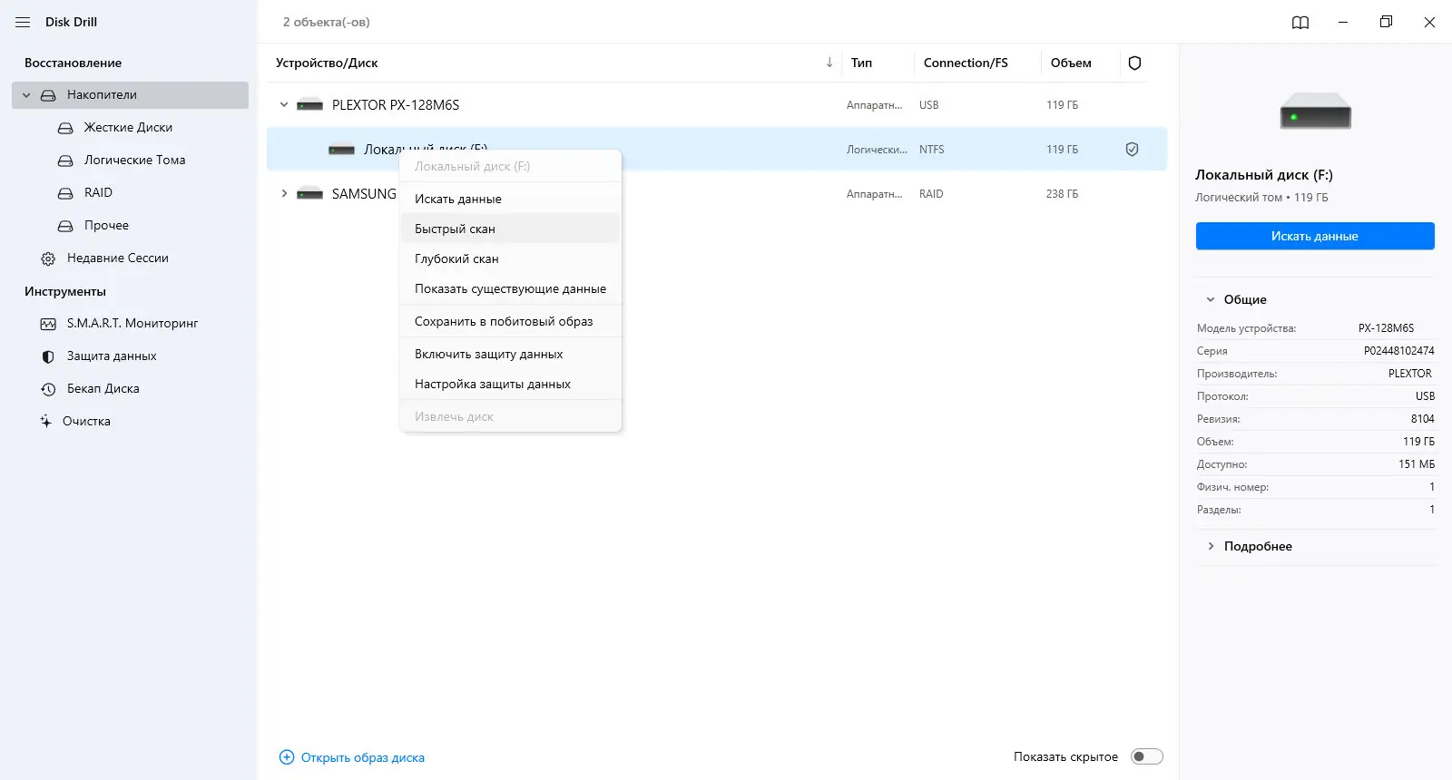 Disk Drill — это мощная программа для восстановления файлов на Windows, способная вернуть данные с жестких дисков, флешек, камер и других носителей. Поддерживает все основные файловые системы, включая NTFS, FAT32, exFAT, HFS+ и EXT4. Обеспечивает быстрое и глубокое сканирование, а также восстановление после сбоев, вирусов и случайного удаления.