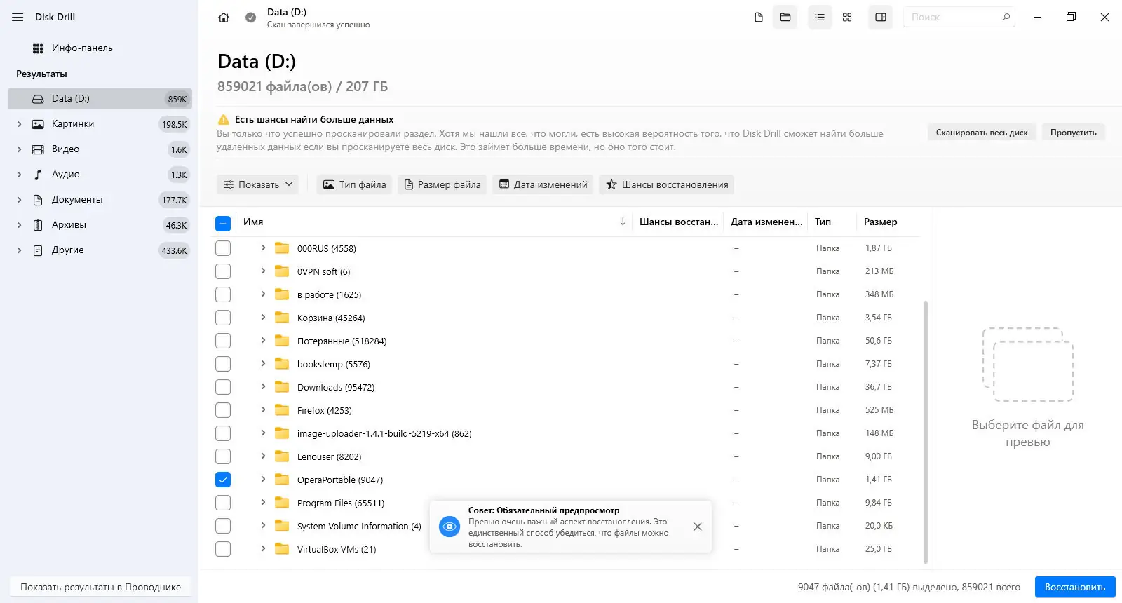 - Быстрое и глубокое сканирование с возможностью восстановления по ходу анализа