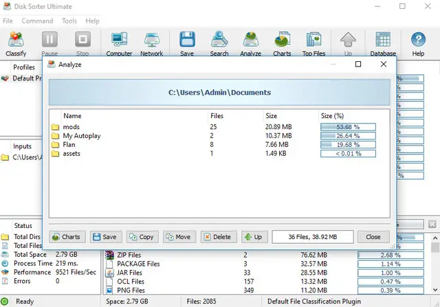 Использование Disk Sorter не требует глубоких технических знаний. После запуска приложения пользователь выбирает нужный диск, каталог или сетевой ресурс, затем нажимает кнопку «Классифицировать». Система начинает сканирование, отображая прогресс и собирая информацию о каждом файле. По завершении сканирования все данные группируются в удобной таблице с указанием категории, количества файлов, их суммарного размера и доли в общем объёме. Дополнительно доступна фильтрация по пользователю, дате последнего доступа и другим параметрам. Для частого использования можно сохранить до трёх профилей с предустановленными настройками сканирования, включая путь, тип сортировки и имя конфигурации.