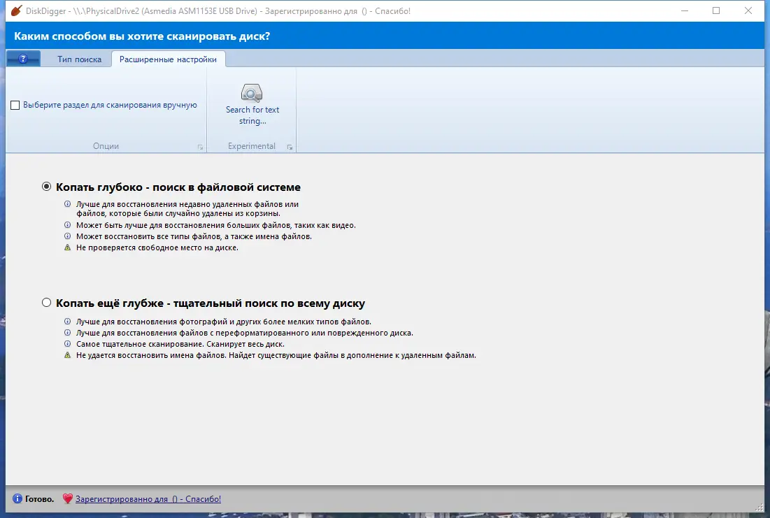 - Работает в двух режимах: быстром (по метаданным) и полном (поиск по сигнатурам файлов).