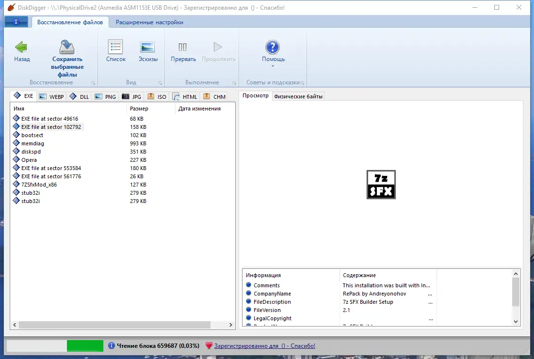 Использование DiskDigger не требует глубоких технических знаний. После запуска программы выбирается нужный диск или раздел, после чего запускается сканирование. В зависимости от выбранного режима, процесс может занять от нескольких минут до часа. В интерфейсе отображаются найденные файлы с возможностью сортировки по типу, дате или размеру. Для каждого элемента доступен предварительный просмотр, включая миниатюры изображений, обложки альбомов и содержимое архивов. Восстановленные файлы можно сохранить в указанную папку на любом доступном носителе. Программа также позволяет сканировать дамп первых 4 килобайт файла, что помогает в идентификации повреждённых данных.