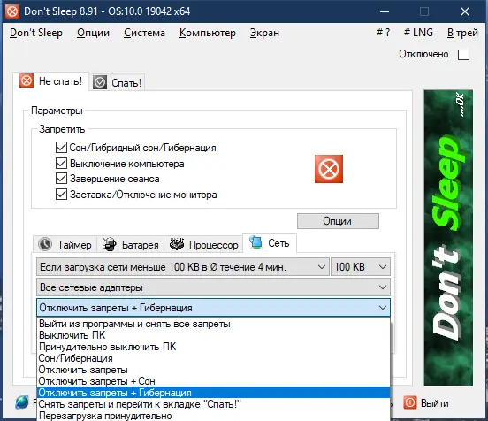 - Позволяет отключать спящий режим, гибернацию, блокировку рабочего стола и активацию хранителя экрана.