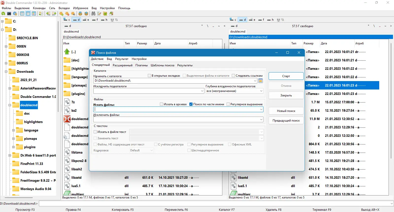 - Поиск файлов по имени и содержимому, включая текст в бинарных файлах, осуществляется с гибкими настройками фильтрации и регулярными выражениями.