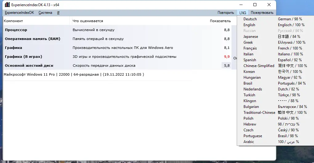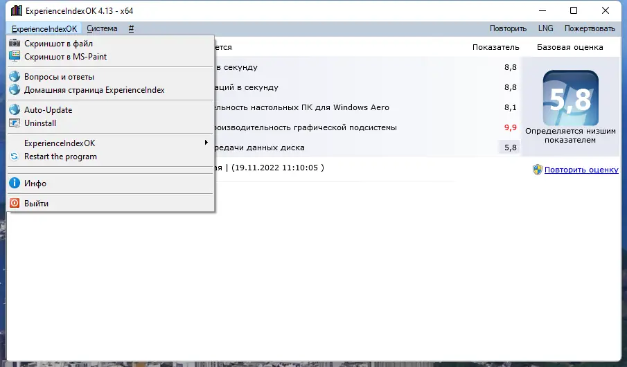 После запуска программы пользователь видит основное окно с кнопкой инициализации теста. Для начала анализа необходимо нажать на соответствующую кнопку, после чего ExperienceIndexOK запустит встроенные средства Windows для оценки производительности. По завершении тестирования требуется перезапустить приложение, чтобы увидеть обновлённые результаты. Перед запуском рекомендуется закрыть сторонние приложения, чтобы избежать искажений в данных. Поддержка русского языка настраивается через меню LNG, что упрощает использование для русскоязычных пользователей.